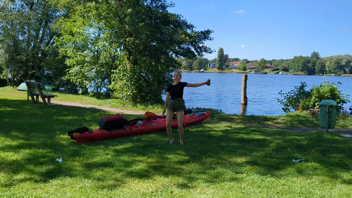 Dieses Mal haben wir kein Ziel, das uns antreibt, eine bestimmte Kilometerzahl pro Tag zurückzulegen. Wie wirkt sich das aus? Zusammengefasst: die Zeit füllt sich unvorhersehbarer und trotzdem schnell. Wir stehen später auf und jede Handlung wird gerade so schnell vollzogen, wie ich gerade Lust habe, sie zu vollziehen. Die Mittagspause dauert so lange, wie es braucht, eine zufriedenstellende Anzahl an Kaffees und Broten zu sich zu nehmen. Und wir paddeln nur so weit, wie es sich gemäß unserer Laune ergibt. Ich finde, es ist ein Aufatmen, das einen echten Kontrast zum Alltag darstellt. Der Tag vergeht zwischen Schilf, Seerosen, Wäldern (heute tauchte sogar eine kleine Hochzeitsgesellschaft zwischen den Bäumen am Ufer auf) und vor allem Wasserwellen, die mal mehr mal weniger wild gegen das Kajak platschen - ähnlich wie die Schwankungen der eigenen Stimmung, die nicht nur mit dem Gang der Wellen korreliert, sondern auch direkt kausal davon verursacht wird: meine Stimmung ist genauso aggressiv wie der Gang der Wellen, je länger dieser mich daran hindert, voranzukommen. Ebenso komme ich sofort zur Ruhe, sobald die Wellen sanft das Boot umsäuseln und manchmal sogar unterstützend antreiben.